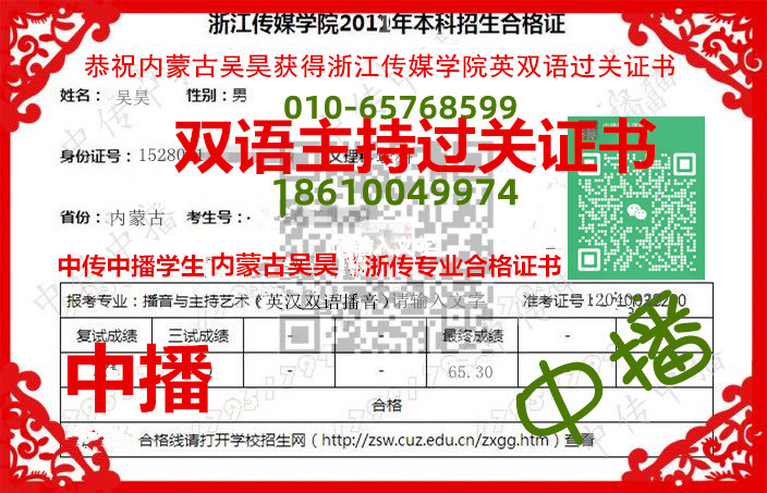中播播音学生来自内蒙古的吴昊获得浙江传媒大学双语主持过关证书